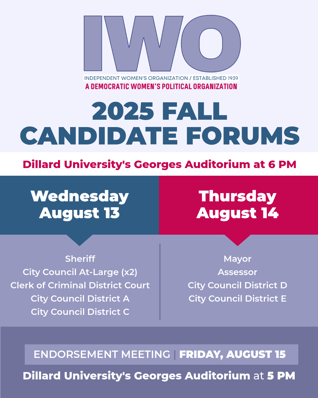 NEW ORLEANS -- On Friday evening, August 15, 2025, the Independent Women’s Organization voted on endorsements for the Fall 2025 elections, endorsing 14 candidates across 10 races on the ballot October 11, 2025. Early Voting runs September 27-October 4, except Sunday, September 28. Members of the IWO endorsed four incumbents and made four dual endorsements. The endorsements are as follows: Mayor State Sen. Royce Duplessis Councilmember Helena Moreno Sheriff Former Superintendent Michelle Woodfork Clerk, Criminal District Court Clerk Darren Lombard Assessor Assessor Errol G. Williams City Council At-Large, Division 1 State Rep. Delisha Boyd State Rep. Matthew Willard City Council At-Large, Division 2 Rev. Gregory Manning Councilmember J.P. Morrell City Council, District A Holly Friedman Aimee McCarron City Council, District C Councilmember Freddie King III City Council, District D Councilmember Eugene Green City Council, District E State Rep. Jason Hughes "The Independent Women’s Organization is proud to endorse this outstanding group of candidates whose values and vision align with our mission of advancing equality, accountability, and opportunity for women and families across New Orleans,” said IWO President Lisa Ray Diggs. “Each of these leaders have demonstrated a deep commitment to good government and to building a stronger, more inclusive future for our city." "The endorsement process is always one of the most engaging and exciting parts of our work. With so many strong candidates stepping forward this year, our members had thoughtful discussions and made thoughtful choices,” said IWO Endorsement Committee Chair Demetric Mercadel. “We are pleased to endorse a broad slate of candidates who we believe will bring energy, integrity, and dedication to public service in New Orleans."